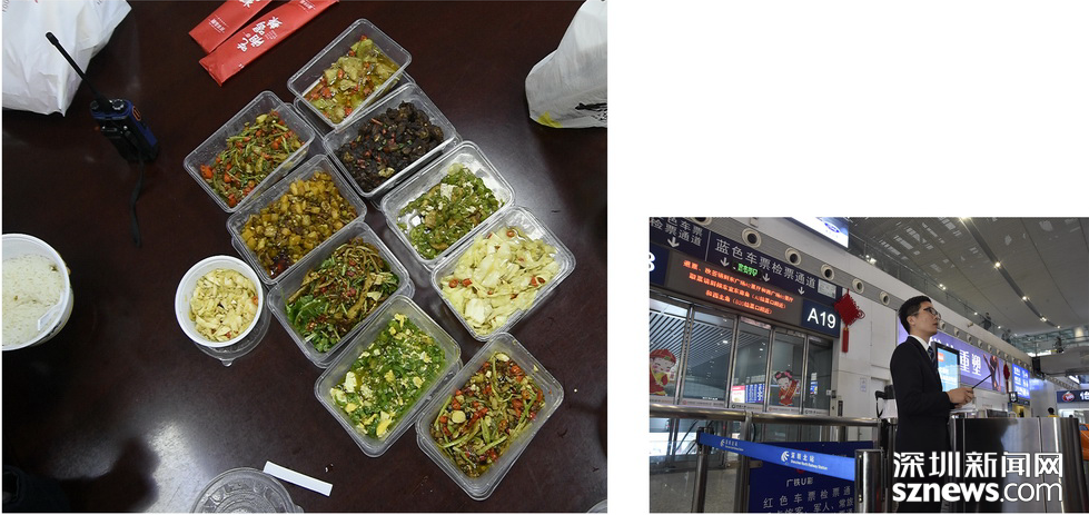 春運第一天,人流如織。從下午2點半上班開始,聶新強忙了5個鐘頭,安全送走大約20萬人。晚上七點半,在各閘機口頂替了五位同事吃晚飯之后,聶新強終于吃上了“豪華”外賣“快餐”,“豪”的是一人獨享八人份,“快”的是只用了10分鐘不到就結束了戰(zhàn)斗。
