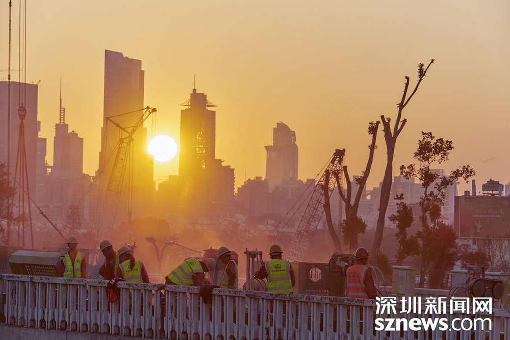 深圳新聞網(wǎng)2019年2月3日訊(記者 黃賢娟 趙穎致 黃婉婷 胡志方 林婉婷)與日漸冷清下來的街道商鋪不同,春節(jié)前夕的黃木崗立交仍是一片繁忙景象。這是2月2日傍晚,數(shù)百名身穿橙黃馬甲的工人正在忙著將立交橋切割分離。平板車、模塊車往來穿梭,將一塊塊拆卸下來的橋體陸續(xù)運走。夕陽西下,橙黃色工服反射出點點熒光,成為安靜的城市中獨特的點綴。