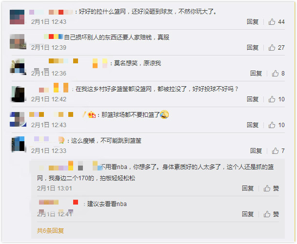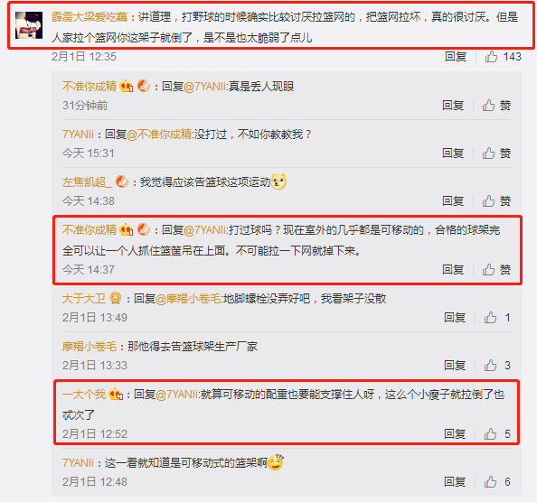 還有一些網(wǎng)友借機(jī)表達(dá)了自己對(duì)某類(lèi)人的"墻裂"不滿(mǎn)?。](méi)事兒拉什么球框啊,以為在打 NBA?。ⅲ⒒钤?,打球就煩不能扣還裝 X的"......