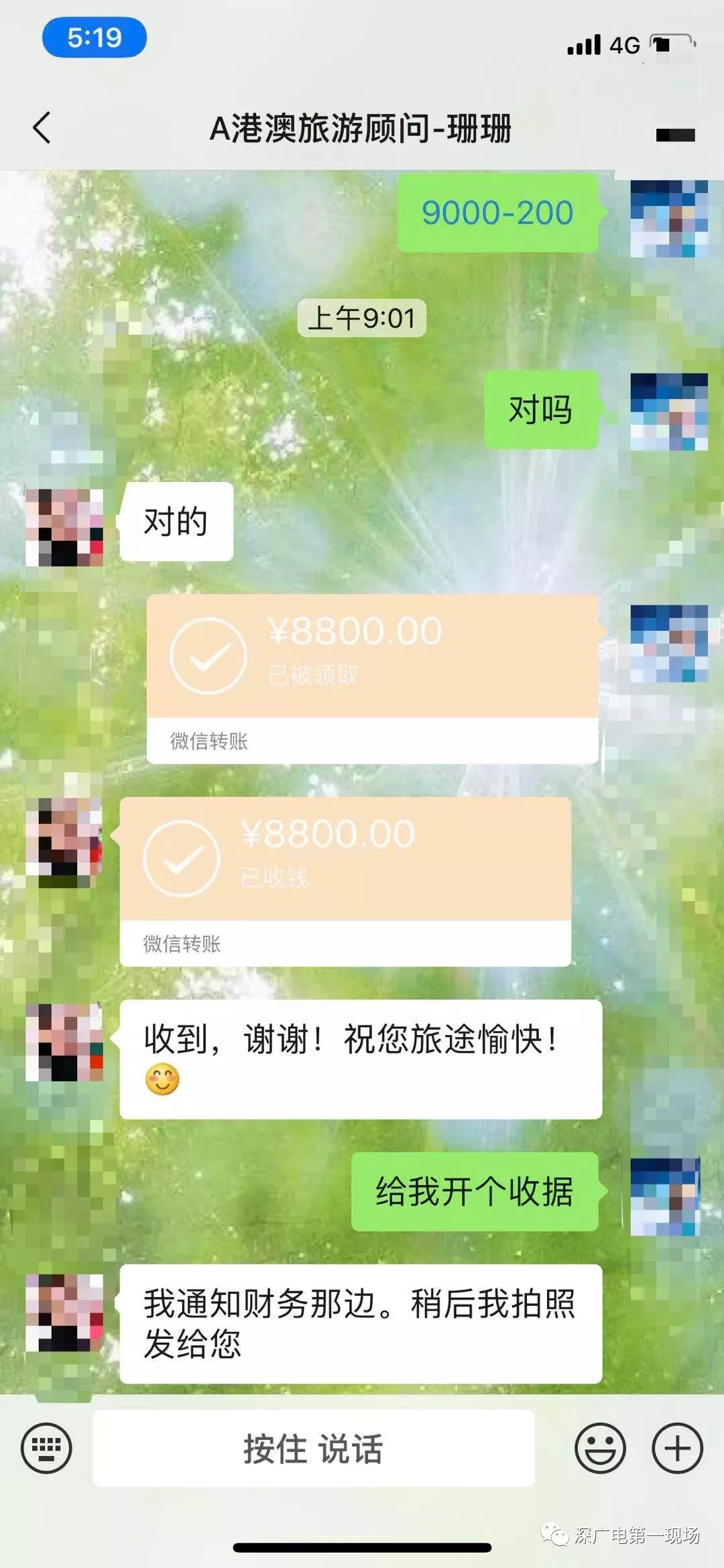 8號(hào)上午,記者先后用電話、微信等方式聯(lián)系上了,剛躲進(jìn)香港海港城馬哥孛羅酒店的李女士。她說(shuō),1月31日通過(guò)百度搜索“港澳游”,與深圳北方大廈7樓的國(guó)旅,微信名叫“珊珊”的旅游顧問(wèn)聯(lián)系,在支付了200元定金后,于2月6日,從北京飛抵深圳入住了“珊珊”安排的鵬威酒店,并與“珊珊”的同事簽訂了合同。李女士夫婦和他們的孩子以及父母5人,以平均1800元的團(tuán)費(fèi)價(jià)格,參加25-30人的5天4晚精品豪華團(tuán),赴香港澳門(mén)游玩,精品團(tuán)豪華的內(nèi)容是無(wú)購(gòu)物、住“四星”的香港君逸酒店。2月7日上午,他們就從口岸過(guò)關(guān)到了香港。