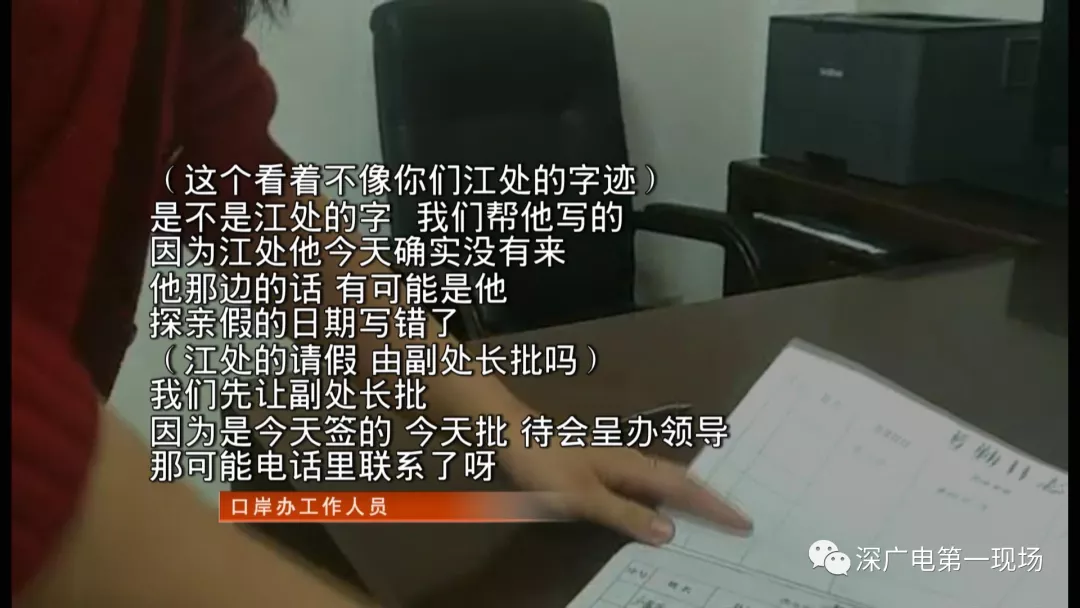 但暗訪發(fā)現(xiàn),也有個別缺崗人員未按照正常流程履行報假手續(xù)。2月11號上午9點40分,市紀(jì)委暗訪組來到深圳市口岸辦公室,發(fā)現(xiàn)該單位到崗率良好,辦公秩序井然。但在暗訪檢查中發(fā)現(xiàn),本應(yīng)登記當(dāng)天在辦公室上班的口岸辦陸路二處處長江某并不在辦公室,經(jīng)核對其請休假情況,其提交的休假報告是從2月12號開始,但11號,他人已經(jīng)沒有到崗。隨后,該處一名工作人員拿出了一份登記表,表上寫名該處長今天補休。然而,領(lǐng)導(dǎo)簽字一欄并非單位主管或分管領(lǐng)導(dǎo),而是該處的一名副處長。暗訪人員發(fā)現(xiàn)這份登記表是11號當(dāng)天才填寫的。