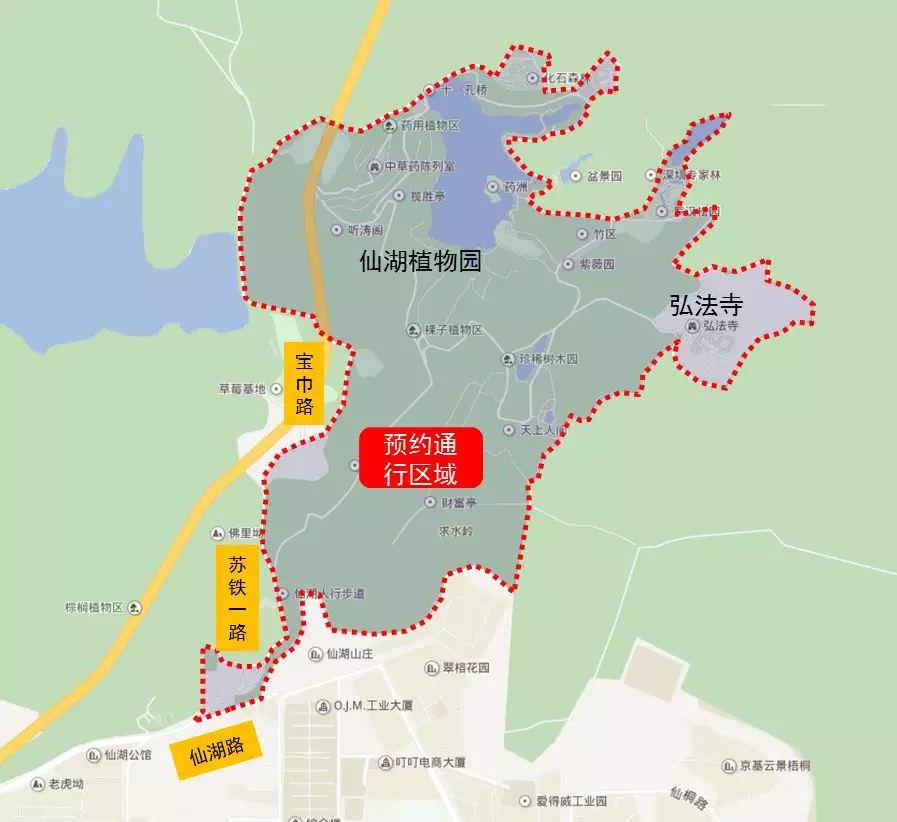 仙湖路(蓮十路東段)及仙湖植物園,含仙湖植物園正門立體停車樓,仙湖植物園內(nèi)弘法寺停車場。