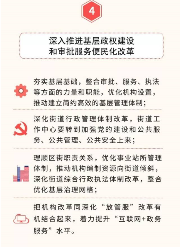 五是全面落實優(yōu)化協(xié)同高效原則。堅持一件事情原則上由一個部門負責,把理順職責放在重要位置,從有利于突出主業(yè)、有利于服務管理的角度出發(fā),實事求是,科學設置黨委和政府機構,宜大則大、宜小則小,該加強的加強、該精簡的精簡、該優(yōu)化的優(yōu)化,實現(xiàn)機構職責的深度融合。