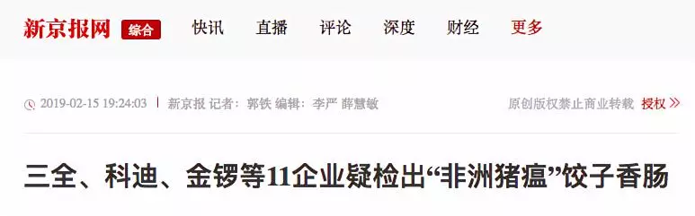 據(jù)紅星新聞報道,多家媒體稱,2月9日,湖南省湘西自治州重大動物疫病防制指揮部辦公室接到省防治重大動物疫病指揮部辦公室通知,要求瀘溪縣重大動物疫病防制指揮部辦公室對來源于吉首市凌云冷凍食品批發(fā)部凍庫的產(chǎn)品進行抽樣,在瀘溪縣好又多和萬家福兩家超市共抽取4個批次12份樣品,經(jīng)州動物疫病預防控制中心檢測,其中由河南三全食品有限公司生產(chǎn)批次為20190113H的“三全灌湯水餃”3份樣品為非洲豬瘟病毒核酸陽性。