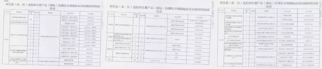 除速凍食品外,該網(wǎng)友發(fā)帖顯示,標稱河南省長隆食品有限責任公司、濟南康利斯食品有限公司、山東齊匯食品有限公司、山東臨沂金鑼文瑞食品有限公司、河南惠萬家食品有限公司、合肥市凱樂斯食品有限公司生產(chǎn)的培根、香腸、火腿腸等個別批次產(chǎn)品樣品,也被檢出非洲豬瘟病毒核酸陽性。