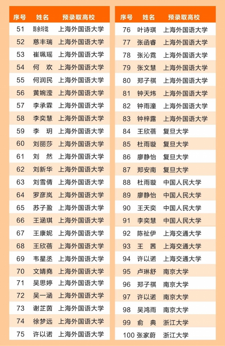 2019屆外語(yǔ)書院保送工作一路凱歌,除8人尚未考試外,126位學(xué)生已獲得來(lái)自33所國(guó)內(nèi)知名高校的289份預(yù)錄取通知,達(dá)到歷史之最。其中:北京大學(xué)7人,清華大學(xué)2人,浙江大學(xué)4人,上海交通大學(xué)3人,復(fù)旦大學(xué)4人,中國(guó)人民大學(xué)4人,南京大學(xué)4人,北京外國(guó)語(yǔ)大學(xué)40人,上海外國(guó)語(yǔ)大學(xué)34人,華南理工大學(xué)31人。復(fù)旦大學(xué)、南京大學(xué)、北京外國(guó)語(yǔ)大學(xué)、上海外國(guó)語(yǔ)大學(xué)、華南理工大學(xué)等均創(chuàng)深外外語(yǔ)類保送預(yù)錄取人數(shù)的歷史紀(jì)錄。南京大學(xué)、中山大學(xué)、北京理工大學(xué)、北京語(yǔ)言大學(xué)、大連理工大學(xué)、重慶大學(xué)、天津大學(xué)、深圳大學(xué)、北京第二外國(guó)語(yǔ)學(xué)院等預(yù)錄取率達(dá)100%。