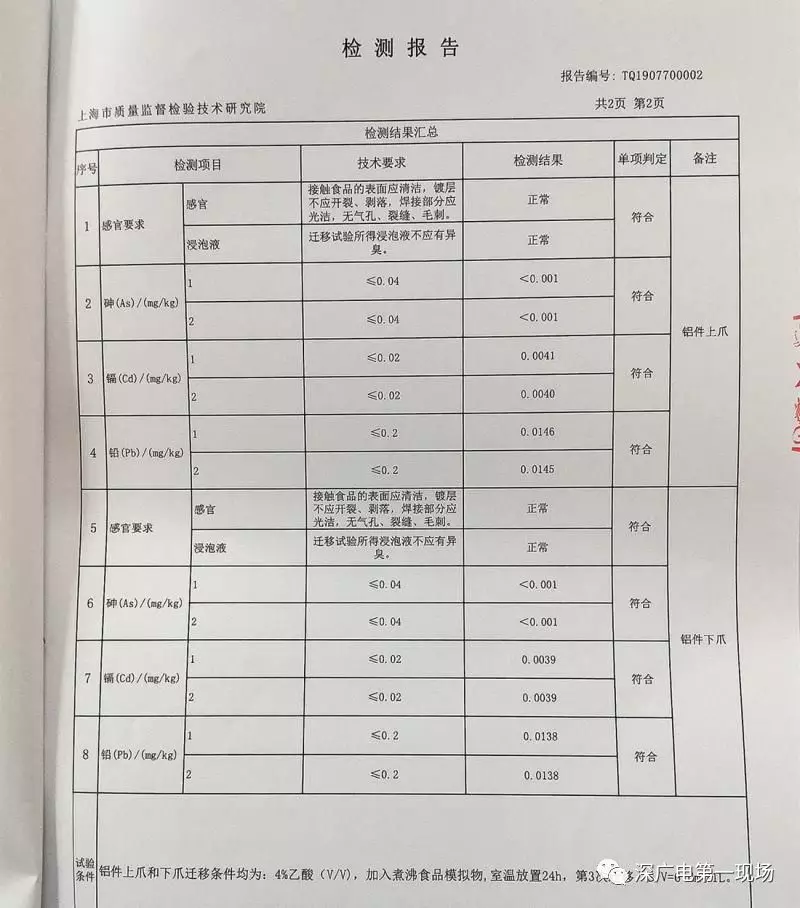 在現(xiàn)場,松江區(qū)市場監(jiān)管局還向記者出示了一份該局抽樣后委托上海市質(zhì)檢院進(jìn)行檢測的檢測報告,檢測對象是“天使之橙”現(xiàn)榨橙汁機的上下爪,檢測依據(jù)就是上述的我國國家標(biāo)準(zhǔn)《食品接觸用金屬材料及制品》。經(jīng)檢測,相關(guān)部件的檢測項目均符合上述標(biāo)準(zhǔn)。