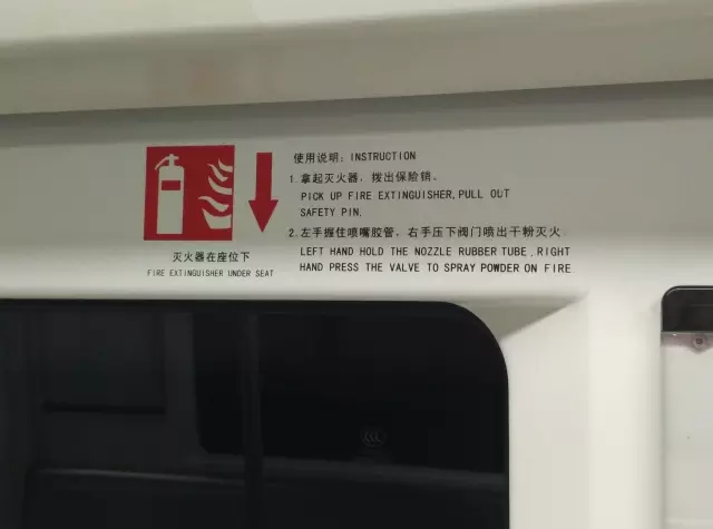 地鐵列車的滅火器布置于客室座椅下方,在其對應(yīng)的上方設(shè)有相應(yīng)的標(biāo)志。滅火器每個客室有2個,其中在列車出現(xiàn)火情的情況下,乘客可自行取出滅火器,按要求對準(zhǔn)起火點進行滅火。