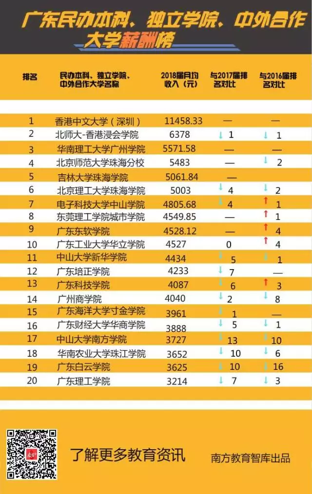 ▲廣東民辦本科、獨(dú)立學(xué)院、中外合作大學(xué)薪酬20強(qiáng),港中文(深圳)成全省首個(gè)平均月薪過萬(wàn)高校。
