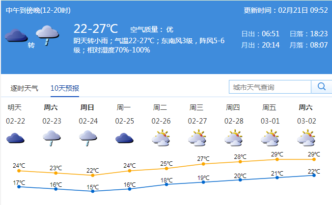 記者從深圳市氣象局了解到,21日深圳市以多云轉(zhuǎn)陰天為主,有分散小雨;氣溫在21-27℃;東南風(fēng)2-3級(jí);相對(duì)濕度65%-95%。