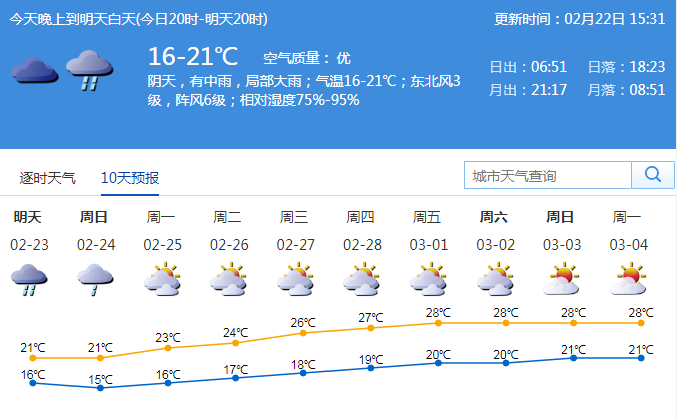 市氣象局預(yù)計,23-24日,深圳市有中雨局部大雨,可能伴有雷暴,降雨時段主要出現(xiàn)在23日白天到24日上午,沿海和高地有7級偏東陣風(fēng);23日氣溫在16-21℃;東北風(fēng)3級;相對濕度75%-95%;25日起多云可見陽光,天氣溫暖。