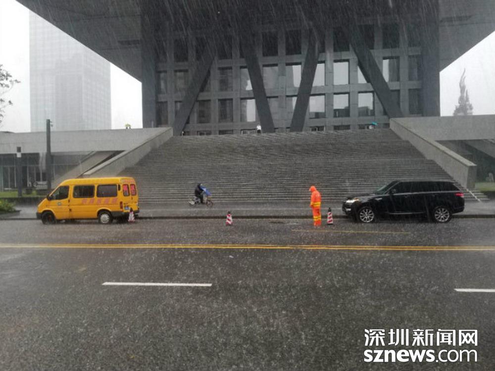 福田區(qū)深南路證券大廈前,工作人員正打開雨水篦子加速排水