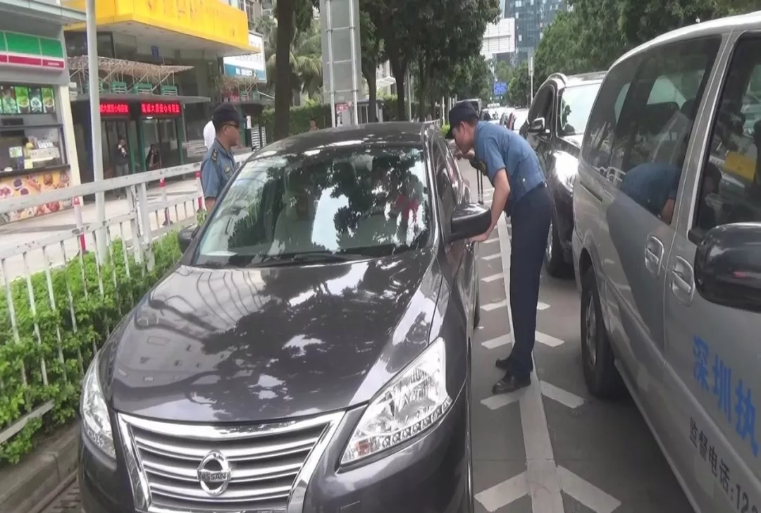 執(zhí)法人員例行對車牌號為粵BT***的小轎車進(jìn)行檢查,司機將車窗降下,緩緩駛?cè)氪龣z區(qū)域。