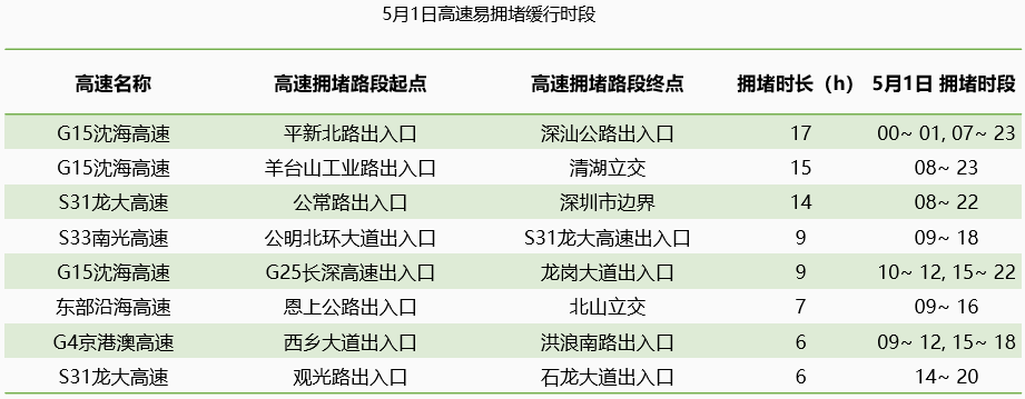 此外,五一期間深圳市內(nèi)易發(fā)生擁堵緩行的路段有羅崗路、西環(huán)路、蘭竹路等。
