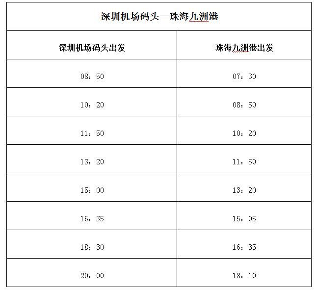 據(jù)深圳航運集團介紹,深圳機場碼頭至珠海九洲港航線開通后,每天共計8個航班16個航次往返兩地,服務(wù)時間從早上7時30分一直到晚上20時,基本實現(xiàn)公交化運營。其中,由深圳機場碼頭出發(fā)的時間分別為8時50分、10時20分、11時50分、13時20分、15時、16時35分、18時30分和20時;由珠海九洲港出發(fā)的時間分別為7時30分、8時50分、10時20分、11時50分、13時20分、15時05分、16時35分及18時10分。