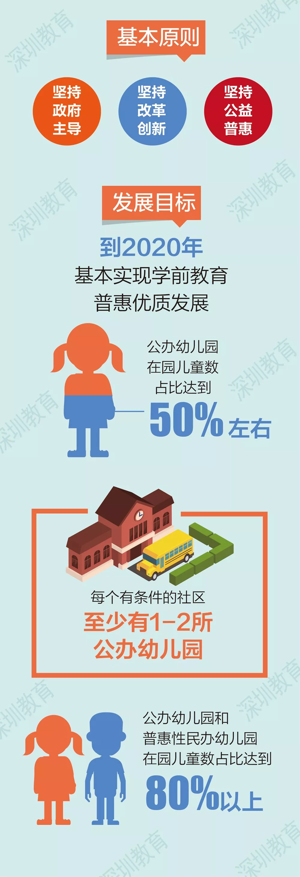 目前深圳共有各類(lèi)幼兒園1771所,其中,公辦幼兒園共68所,占比僅3.8%。根據(jù)《意見(jiàn)》及《通知》的內(nèi)容,到2020年,全市幼兒園總量預(yù)計(jì)達(dá)到1967所,其中公辦園和普惠性幼兒園占比達(dá)到80%以上,公辦園約984所,在園兒童占比達(dá)到50%;普惠性民辦幼兒園約590所,占比30%以上;營(yíng)利性民辦幼兒園393所,占比20%以?xún)?nèi)。深圳將用3-5年時(shí)間,基本實(shí)現(xiàn)學(xué)前教育普惠優(yōu)質(zhì)多樣化發(fā)展。