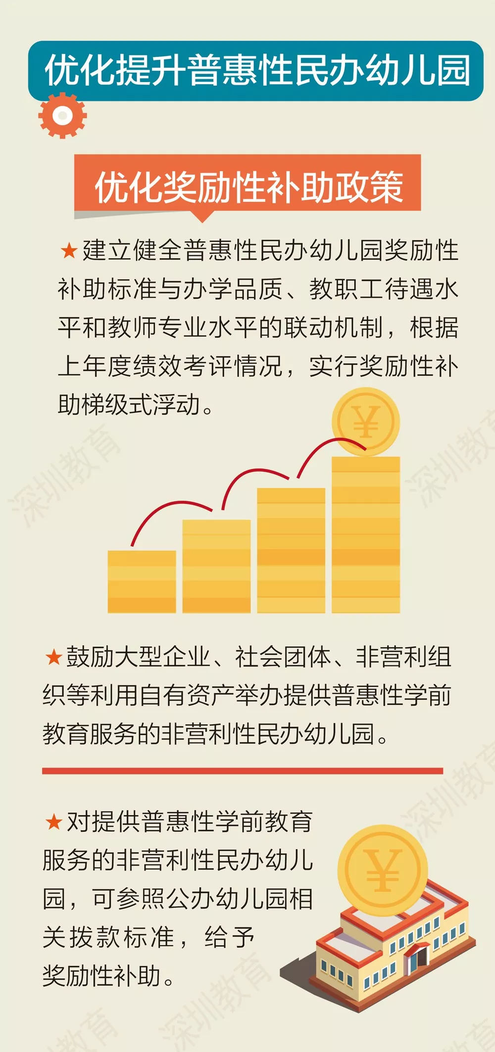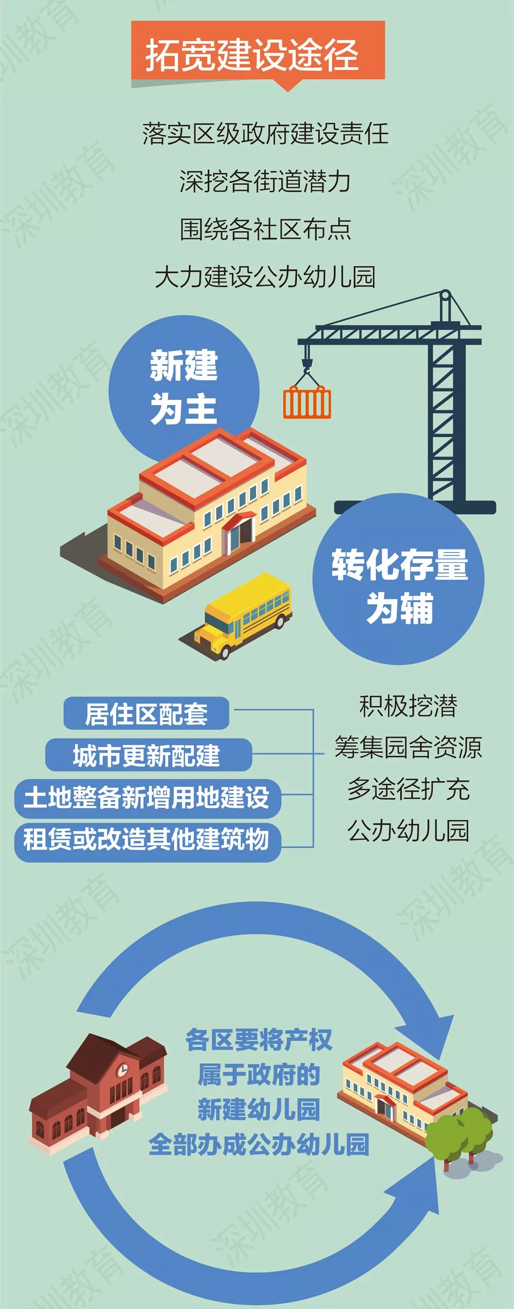 深圳公辦園建設(shè)策略將以市政府主導(dǎo)統(tǒng)籌推進(jìn)動(dòng),各區(qū)政府履行主體責(zé)任,挖掘各街道潛力,圍繞各社區(qū)布點(diǎn),力爭(zhēng)每個(gè)社區(qū)有1-2所公辦園,每年新建2萬(wàn)個(gè)以上學(xué)前教育學(xué)位。加大幼兒園規(guī)劃與建設(shè)力度,鼓勵(lì)社會(huì)力量興辦幼兒園和其他類(lèi)型學(xué)前教育機(jī)構(gòu)。