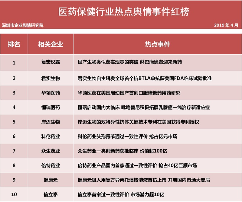 深圳新聞網(wǎng)2019年5月7日訊 (記者田志強(qiáng) 通訊員陳文光)5月7日,深圳企業(yè)輿情研究院發(fā)布第十四批企業(yè)輿情榜單。本次榜單重點(diǎn)聚焦房地產(chǎn)及醫(yī)藥保健兩個(gè)行業(yè)。醫(yī)藥保健行業(yè)輿情榜單由醫(yī)療保健行業(yè)熱點(diǎn)輿情事件排行榜(紅、黑榜)及醫(yī)藥保健行業(yè)企業(yè)公眾形象排行榜組成。