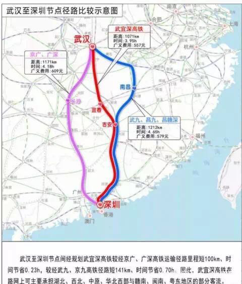 據(jù)了解,為了分流日益飽和的京廣高鐵客流,湖北提出擬在武漢和深圳之間建設(shè)一條高鐵。武深高鐵大致走向?yàn)椋何錆h -咸寧 -修水 -銅鼓 -宜豐 -萬載 -宜春 -安福 -井岡山 -遂川 -贛州 -深圳。一旦建成,將形成武漢到深圳的一條筆直線路。初步預(yù)測分析,新規(guī)劃的武漢至深圳高速鐵路,較經(jīng)京廣、廣深高鐵運(yùn)輸徑路里程短100多公里,時間節(jié)省20分鐘;較經(jīng)武九、京九高鐵徑路短141公里,時間節(jié)省42分鐘。