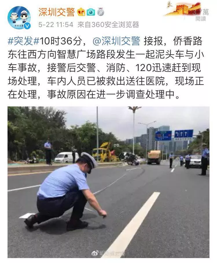 據(jù)@深圳交警官方微博消息,10時(shí)36分,僑香路東往西方向智慧廣場(chǎng)路段發(fā)生一起泥頭車(chē)與小車(chē)事故,接警后交警、消防、120迅速趕到現(xiàn)場(chǎng)處理,車(chē)內(nèi)人員已被救出送往醫(yī)院,現(xiàn)場(chǎng)正在處理,事故原因在進(jìn)一步調(diào)查處理中。