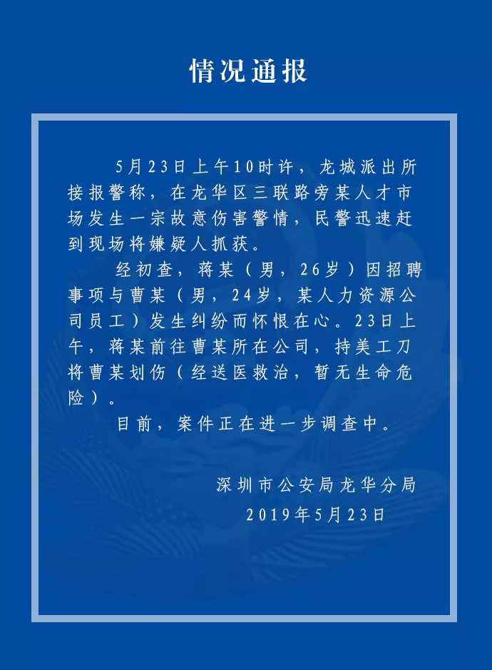 據(jù)警方通報(bào),嫌疑人蔣某因招聘事項(xiàng)與某人力資源公司員工曹某發(fā)生糾紛,懷恨在心。23日上午,蔣某前往曹某所在公司,持美工刀將曹某劃傷。經(jīng)送醫(yī)救治,暫無生命危險(xiǎn),目前案件進(jìn)一步調(diào)查當(dāng)中。