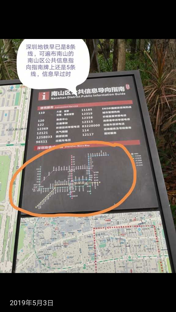 南山區(qū)“公共信息導(dǎo)向指南”指示牌中的地鐵路線信息嚴重滯后(網(wǎng)友供圖)↑