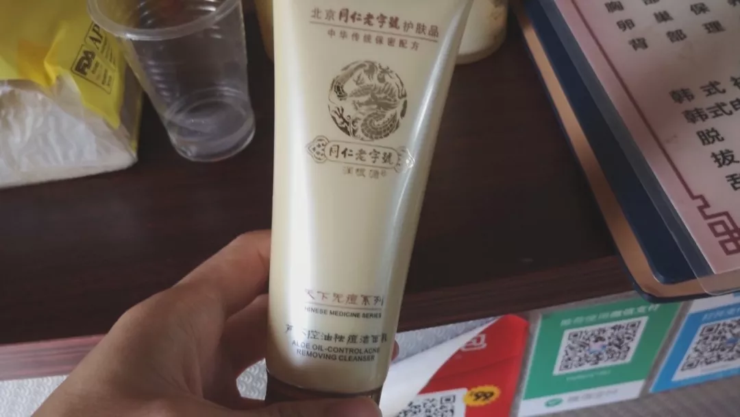 還有少數(shù)養(yǎng)生美容館,出售一款印有“北京同仁堂”字樣商標(biāo)的舒緩膏,委托方是北京同仁堂化妝品有限公司,被委托方為廣州蜜妝生物科技有限公司,而生產(chǎn)許可證完全是粵妝號,而不是藥號。