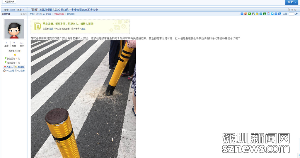 深圳新聞網(wǎng)2019年5月29日訊(記者 劉婷)“蓮花路景田東路交叉口這個(gè)安全島看起來(lái)不太安全?!苯眨W(wǎng)友“專(zhuān)打蒼蠅”在深圳論壇爆料稱(chēng),蓮花路景田東路交叉口安全島警示樁受損,存在安全隱患。5月29日,記者來(lái)到該路段實(shí)地勘察,發(fā)現(xiàn)安全島受損警示樁已全部整改。 (原帖文:蓮花路景田東路交叉口這個(gè)安全島看起來(lái)不太安全)