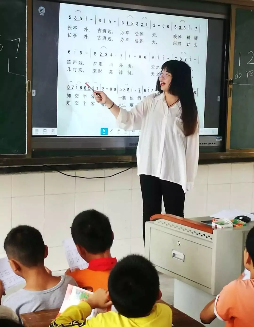 由于資源的缺乏,在平時(shí)的課堂中沒有專業(yè)老師及樂器去幫助他們糾正發(fā)音及音準(zhǔn)問題,只能憑借自己的感覺去唱歌。但在整節(jié)課的教學(xué)中,我發(fā)現(xiàn)部分孩子還是有很好的音準(zhǔn)意識(shí),會(huì)盡量模仿老師發(fā)音去唱譜。如果能得到更多更好的教學(xué)資源,相信孩子們會(huì)更加熱愛音樂。