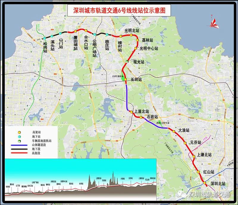 深圳地鐵6號線一期工程由深圳北站至松崗,全長37.85公里,設站20座,其中換乘站6座。