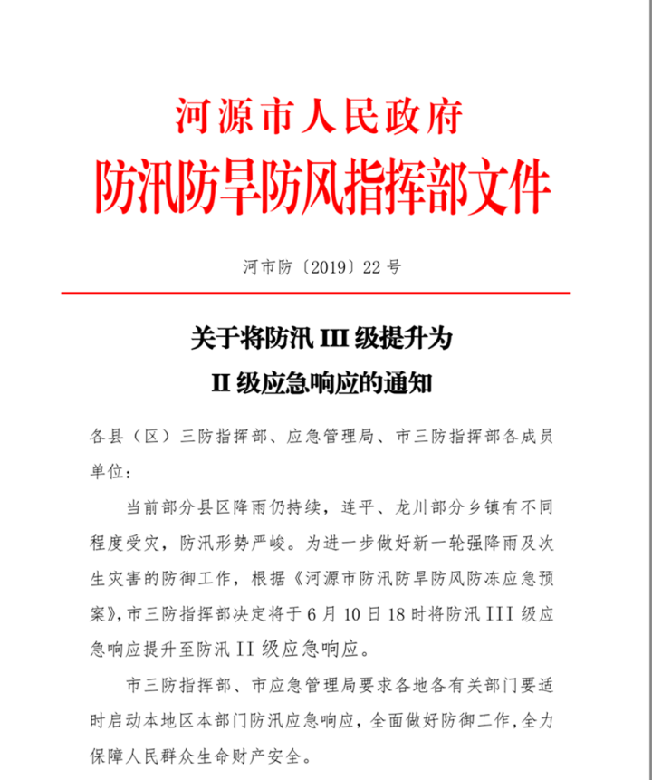 當(dāng)前部分縣區(qū)降雨仍持續(xù),連平、龍川部分鄉(xiāng)鎮(zhèn)有不同程度受災(zāi),防汛形勢嚴(yán)峻。為進(jìn)一步做好新一輪強(qiáng)降雨及次生災(zāi)害的防御工作,根據(jù)《河源市防汛防旱防風(fēng)防凍應(yīng)急預(yù)案》,市三防指揮部決定將于6月10日18時(shí)將防汛III級應(yīng)急響應(yīng)提升至防汛II級應(yīng)急響應(yīng)。