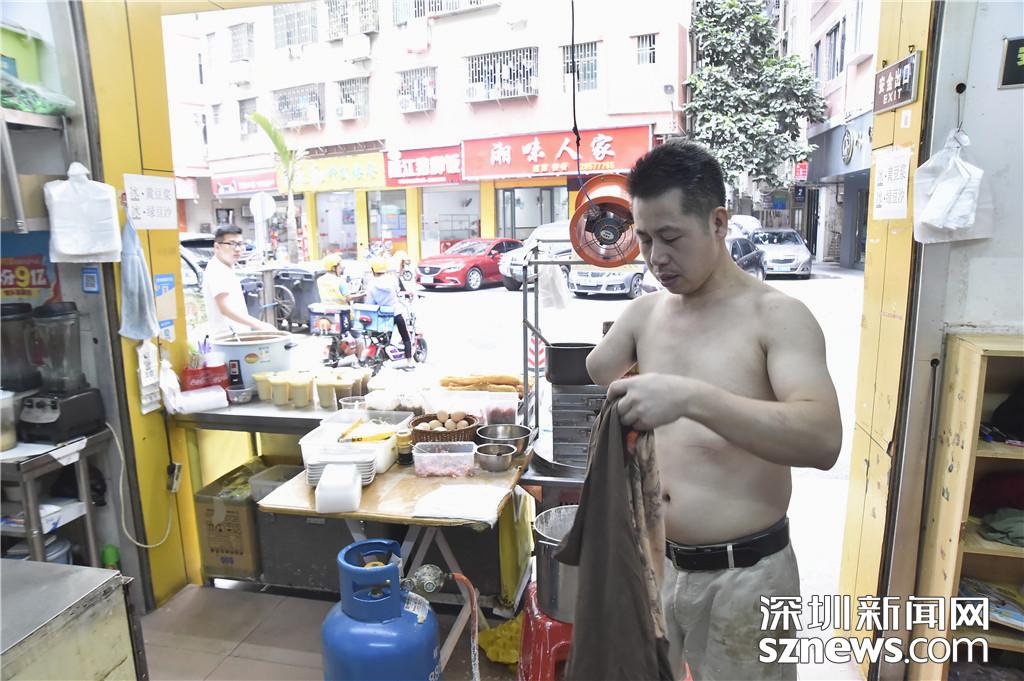 圖為空閑時間,陳用發(fā)脫下衣服擦汗