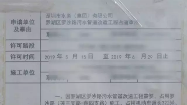 現(xiàn)場的一份施工告知書顯示,正在施工的這項工程,屬于水務(wù)集團(tuán)羅沙路污水管道改造工程,獲得了占用道路挖掘許可。工程周期從5月15日開始到6月29日截止,一共45天。