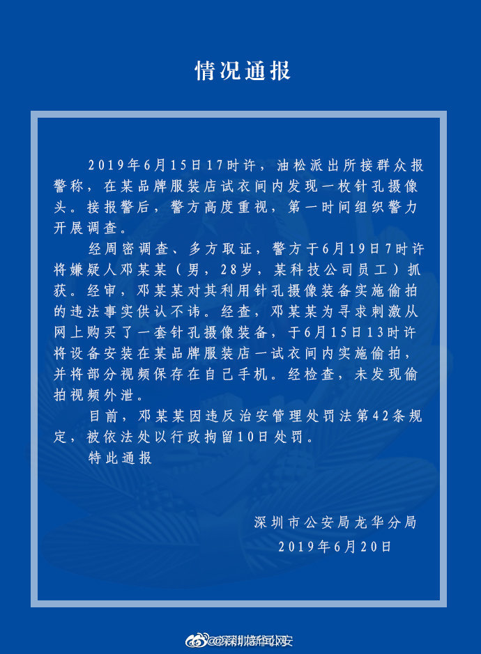 6月19日,深圳市一家優(yōu)衣庫門店暗藏針孔攝像頭一事有了最新進展。龍華警方表示,嫌疑人鄧某某(男,28歲)已被抓獲,其為某科技公司員工,為求刺激安裝,目前被依法處以行拘10日處罰,未發(fā)現(xiàn)視頻外泄。多地多起偷拍事件頻發(fā),證明這不是孤立的個案。想管住日漸泛濫的針孔攝像頭,不能僅靠公眾每次住宿時的“偵探式”自救和“地毯式”搜查,諸多應對的方法也難逃人性與欲望的丑惡。涉事的優(yōu)衣庫門店在事發(fā)時曾表示,檢查試衣間只檢查是否有顧客遺留物品,而此前某涉事酒店負責人以攝像頭安裝隱蔽、工作人員難以發(fā)現(xiàn)、不專業(yè)為由,回避問題。店家事后的說辭讓人心生涼意,大事化小、小事化了的補救措施也不能消除消費者心中的恐懼,作為管理方尚且如此態(tài)度,作為弱勢群體的消費者,還需要多少案例才能換來隱私的保障?