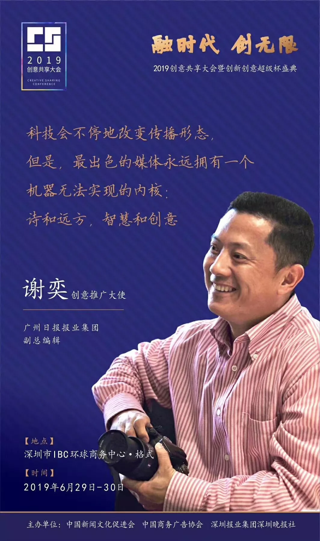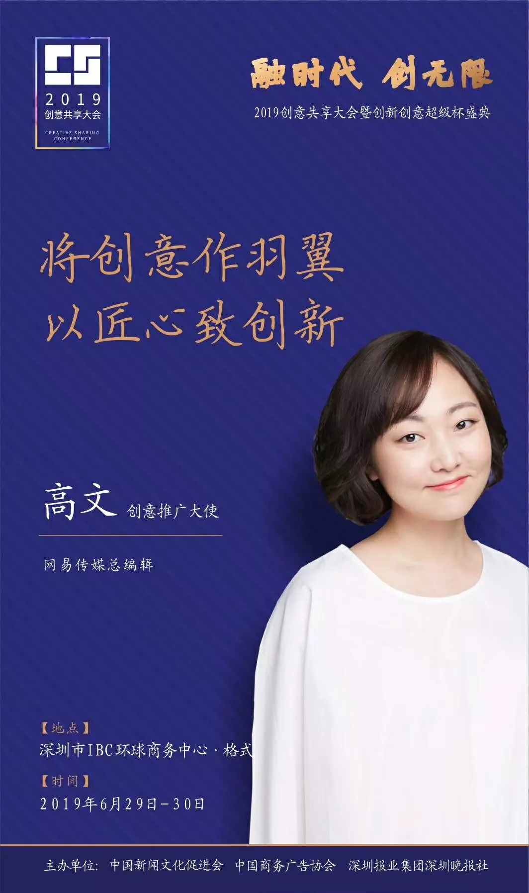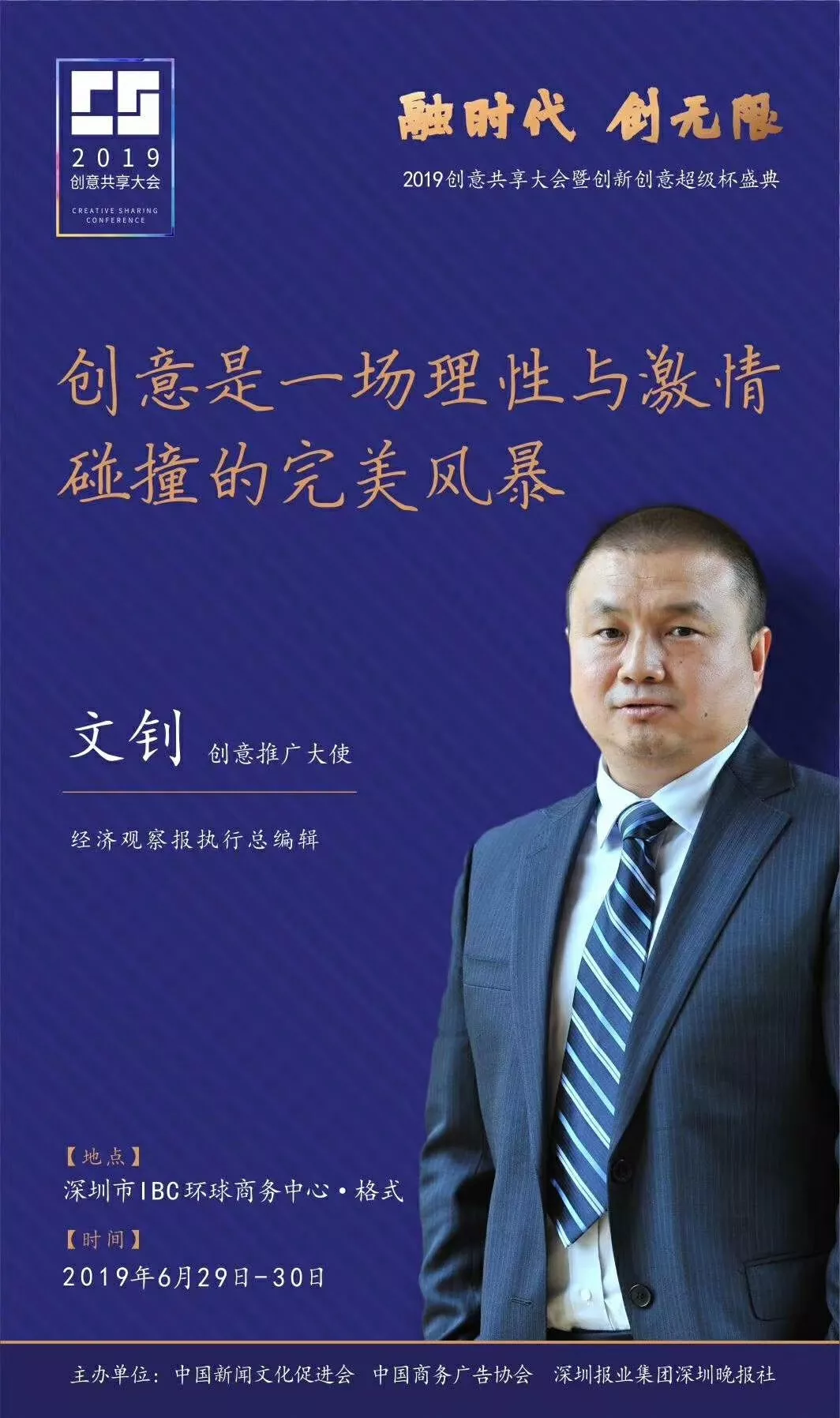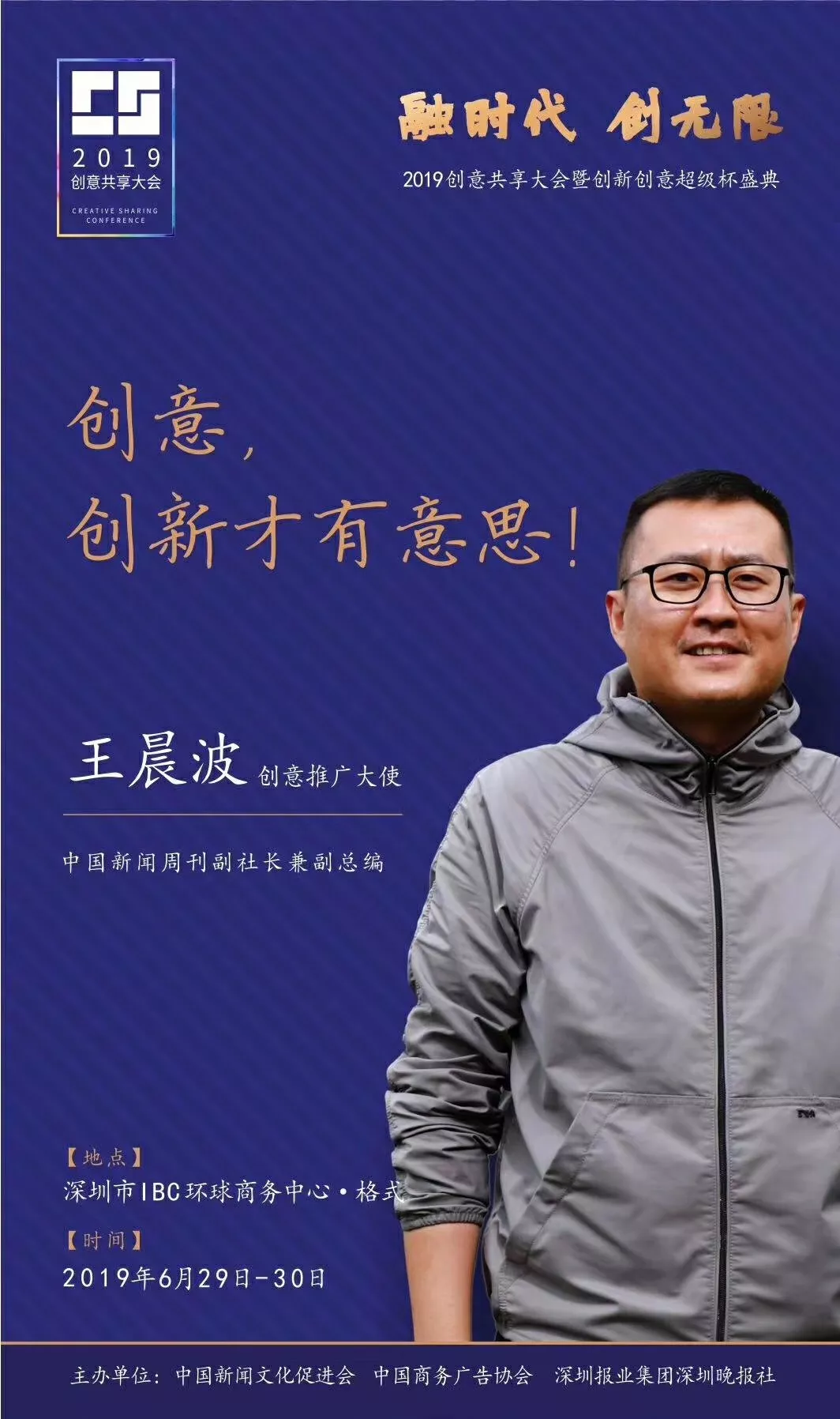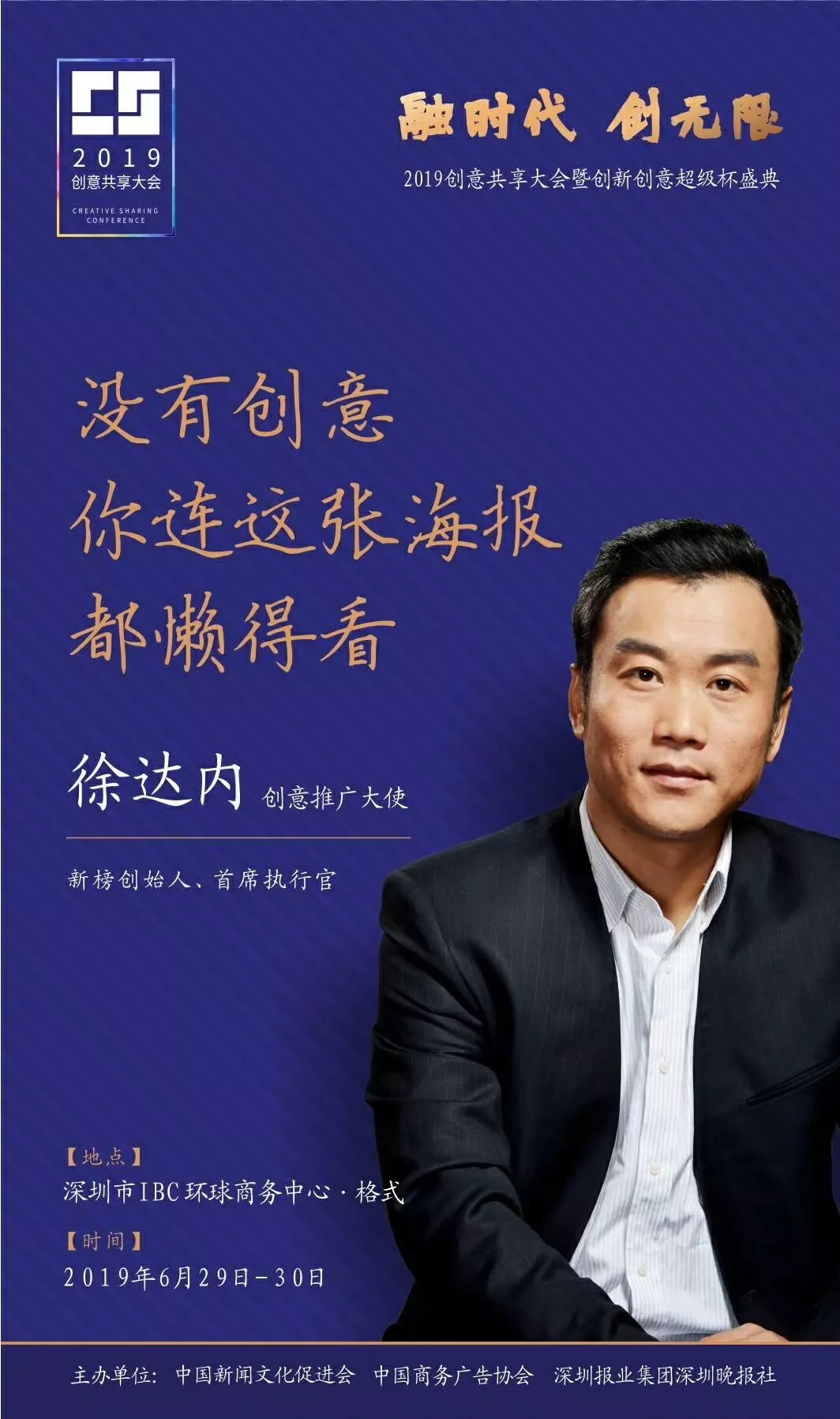 為了展現(xiàn)創(chuàng)意中國的精神風貌和創(chuàng)意傳媒的文化力量,構建創(chuàng)新創(chuàng)意共同體,擘畫美好圖景和未來趨勢,2019年6月29日至30日,由中國新聞文化促進會、中國商務廣告協(xié)會、深圳報業(yè)集團深圳晚報社等聯(lián)合主辦的“融時代創(chuàng)無限——2019創(chuàng)意共享大會暨創(chuàng)新創(chuàng)意超級杯盛典”將在深圳市IBC環(huán)球商務中心隆重舉辦。