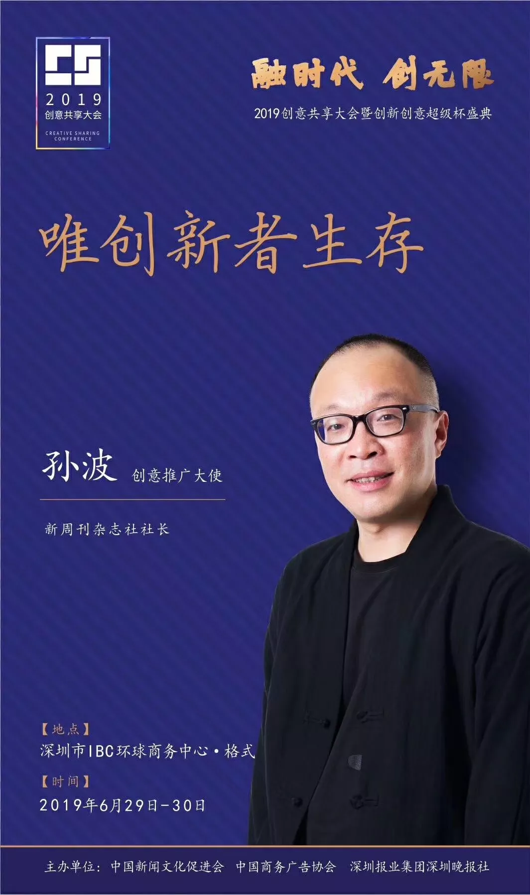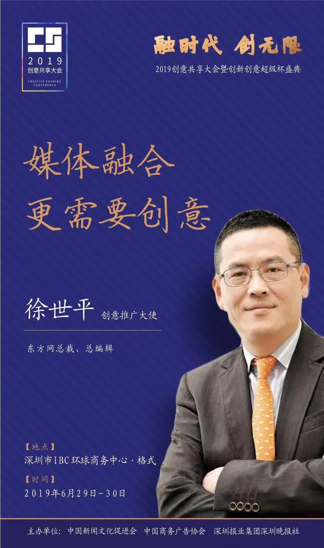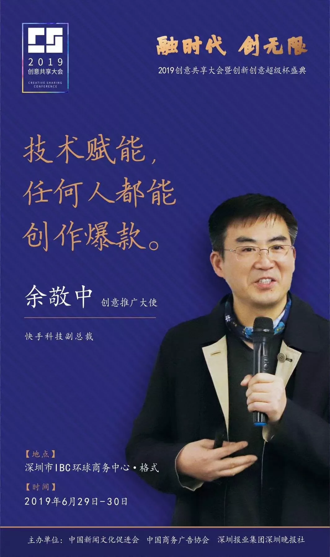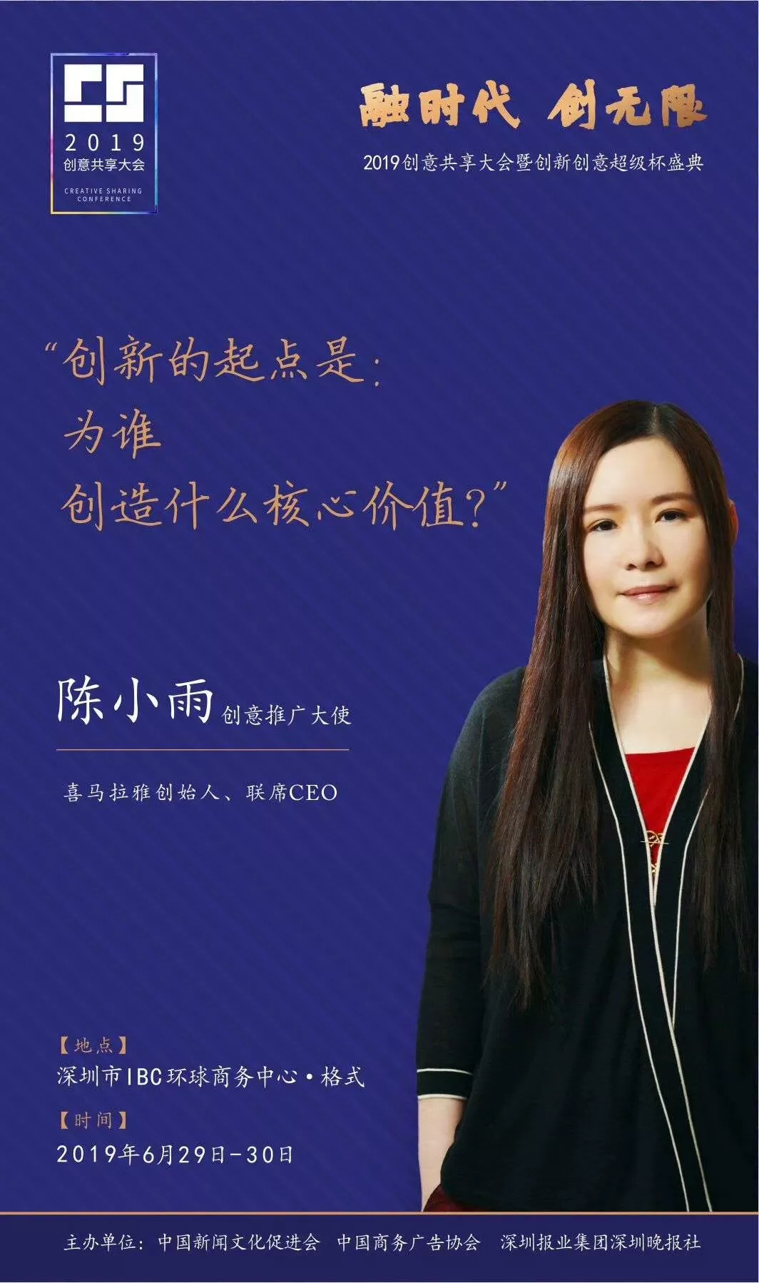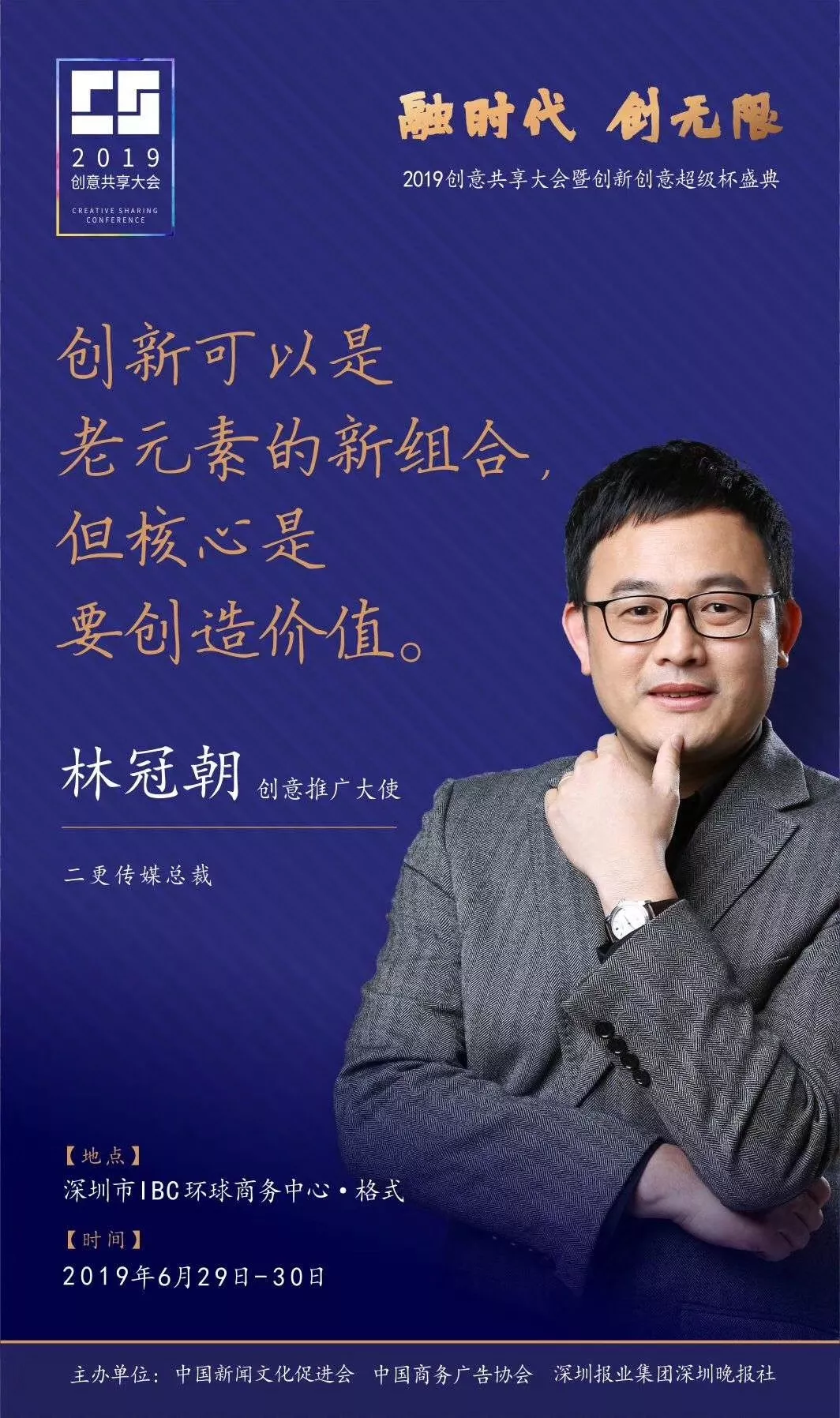 為了展現(xiàn)創(chuàng)意中國的精神風貌和創(chuàng)意傳媒的文化力量,構建創(chuàng)新創(chuàng)意共同體,擘畫美好圖景和未來趨勢,2019年6月29日至30日,由中國新聞文化促進會、中國商務廣告協(xié)會、深圳報業(yè)集團深圳晚報社等聯(lián)合主辦的“融時代創(chuàng)無限——2019創(chuàng)意共享大會暨創(chuàng)新創(chuàng)意超級杯盛典”將在深圳市IBC環(huán)球商務中心隆重舉辦。