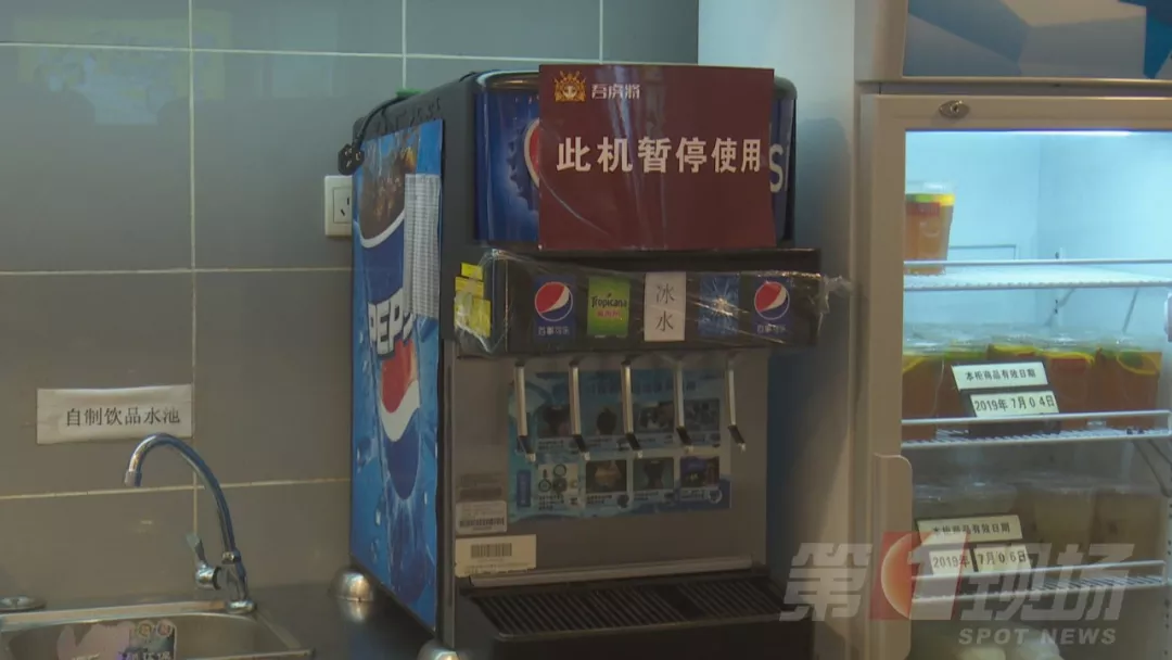今天中午,記者跟隨轄區(qū)市監(jiān)所執(zhí)法人員來(lái)到涉事門店現(xiàn)場(chǎng)檢查。據(jù)了解,2號(hào)事發(fā)后,店里的這臺(tái)飲料機(jī)已經(jīng)暫停使用,目前飲料出口是用保鮮膜封住的。店方稱,飲料機(jī),每個(gè)月由百事可樂(lè)廠家人員深層清洗一次,他們的員工是每天對(duì)飲料機(jī)的糖漿管道和濾嘴進(jìn)行清洗,都有清洗記錄。