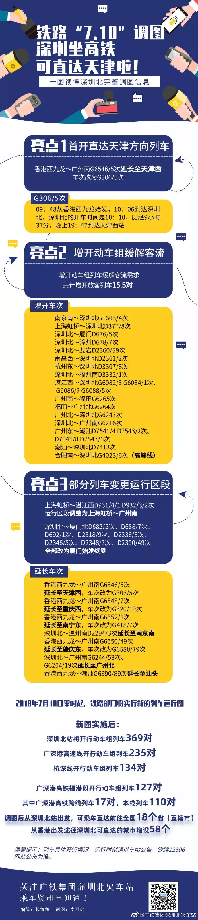 根據(jù)新的運(yùn)行圖安排,深圳北站將開行動(dòng)車組列車369對(duì),廣深港高速線開行動(dòng)車組列車235對(duì);杭深線開行動(dòng)車組列車134對(duì)?!?·10”調(diào)圖后,深圳北站首開前往天津方向列車,屆時(shí)從深圳北站出發(fā),可乘車直達(dá)前往全國(guó)18個(gè)?。ㄖ陛犑校粡南愀鄢霭l(fā)途徑深圳北可直達(dá)的城市增設(shè)58個(gè)。
