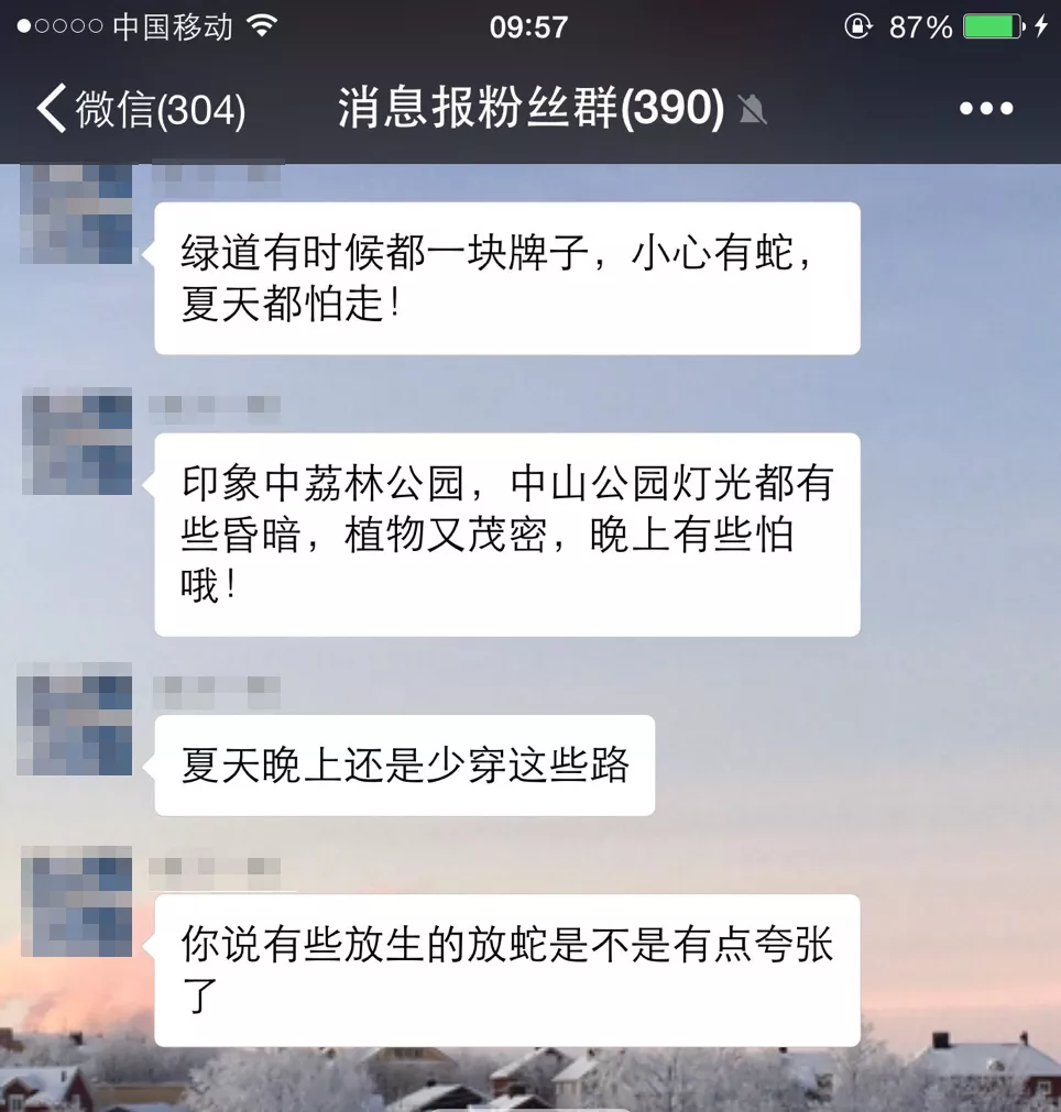 荔林公園蛇出沒的消息,在蛇口消息報微信粉絲群里炸開了鍋,有網(wǎng)友表示,此現(xiàn)象甚是危險,希望能加強(qiáng)管理。