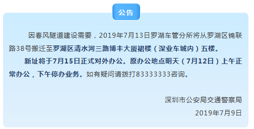公告 因春風(fēng)隧道建設(shè)需要,2019年7月13日羅湖車管分所將從羅湖區(qū)錦聯(lián)路38號(hào)搬遷至羅湖區(qū)清水河三路博豐大廈裙樓(深業(yè)車城內(nèi))五樓。_ _ _ _ _ 羅湖分所新址采用全開放式的業(yè)務(wù)辦理窗口,并配套了多種自助辦理設(shè)備,為群眾構(gòu)建更加便捷高效、自主貼心的辦事環(huán)境。