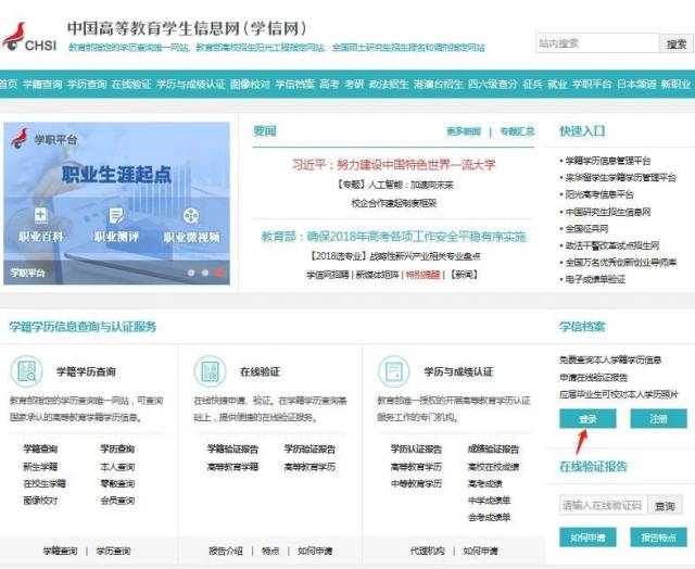 進(jìn)入學(xué)信網(wǎng)網(wǎng)址:http://www.chsi.com.cn/,打開(kāi)之后點(diǎn)擊下圖提示的地方