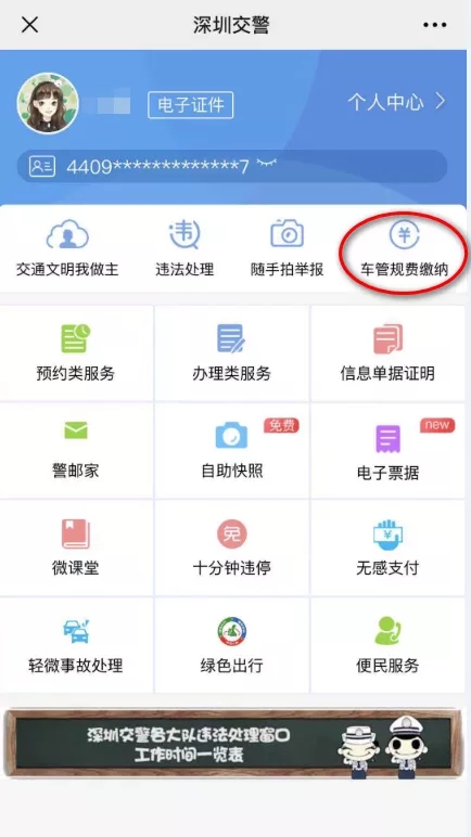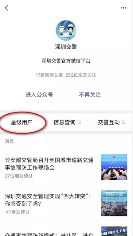 01 車(chē)主本人/代辦人關(guān)注【深圳交警】微信公眾號(hào),點(diǎn)擊進(jìn)入【星級(jí)用戶(hù)】,注冊(cè)登錄星級(jí)用戶(hù)后,在頁(yè)面選擇【車(chē)管規(guī)費(fèi)繳納】。