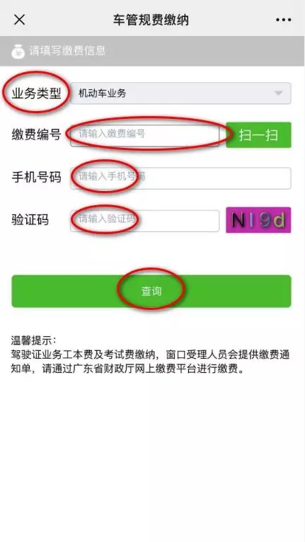 02 業(yè)務(wù)類型選擇【機(jī)動車業(yè)務(wù)】,輸入繳費編號(繳費流水號),填寫本人/代理人手機(jī)號碼、驗證碼后,點擊“查詢”。