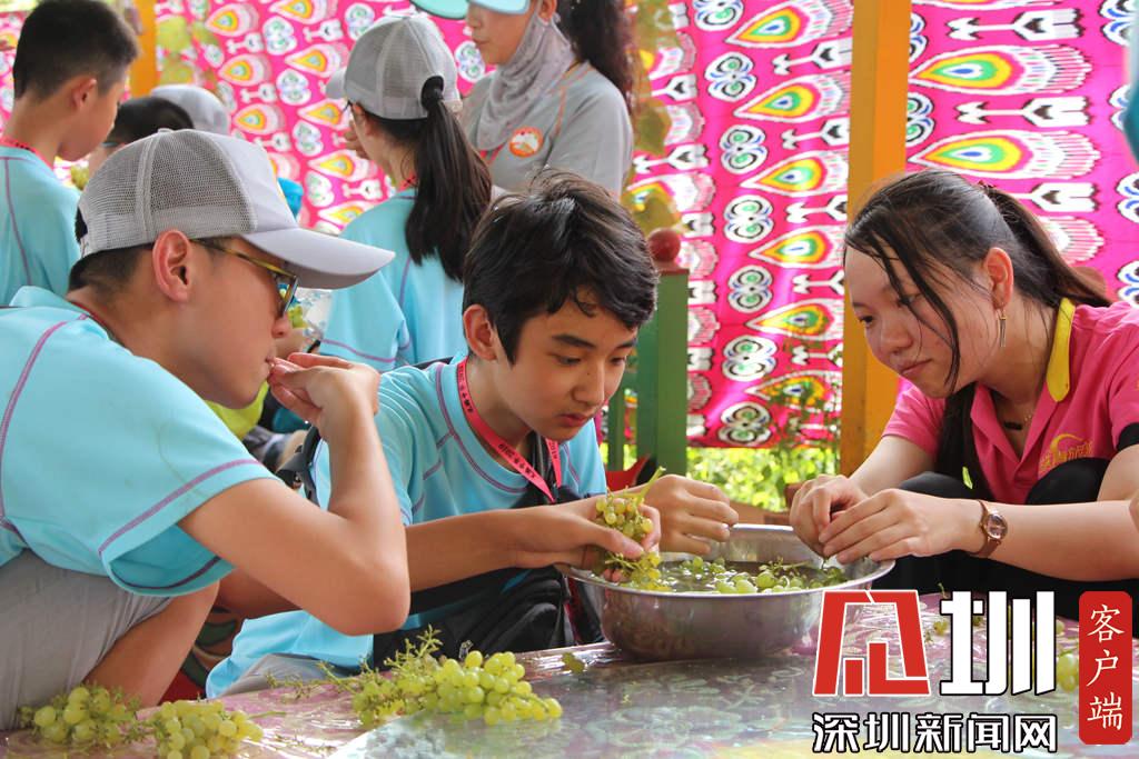 學(xué)生們在葡萄溝景區(qū)里品嘗葡萄。(深圳新聞網(wǎng) 記者吳梓欣 攝)