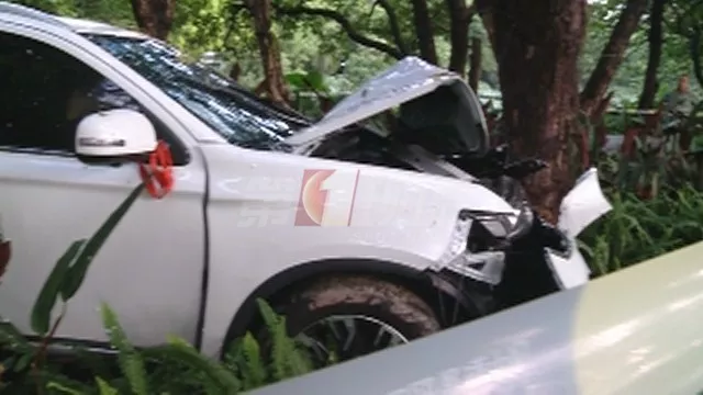 事情發(fā)生在7月21日下午3點(diǎn)50分,在事發(fā)現(xiàn)場(chǎng)可以看到一輛白色三菱汽車撞到了一棵樹,車頭被撞得完全凹陷,支離破碎。