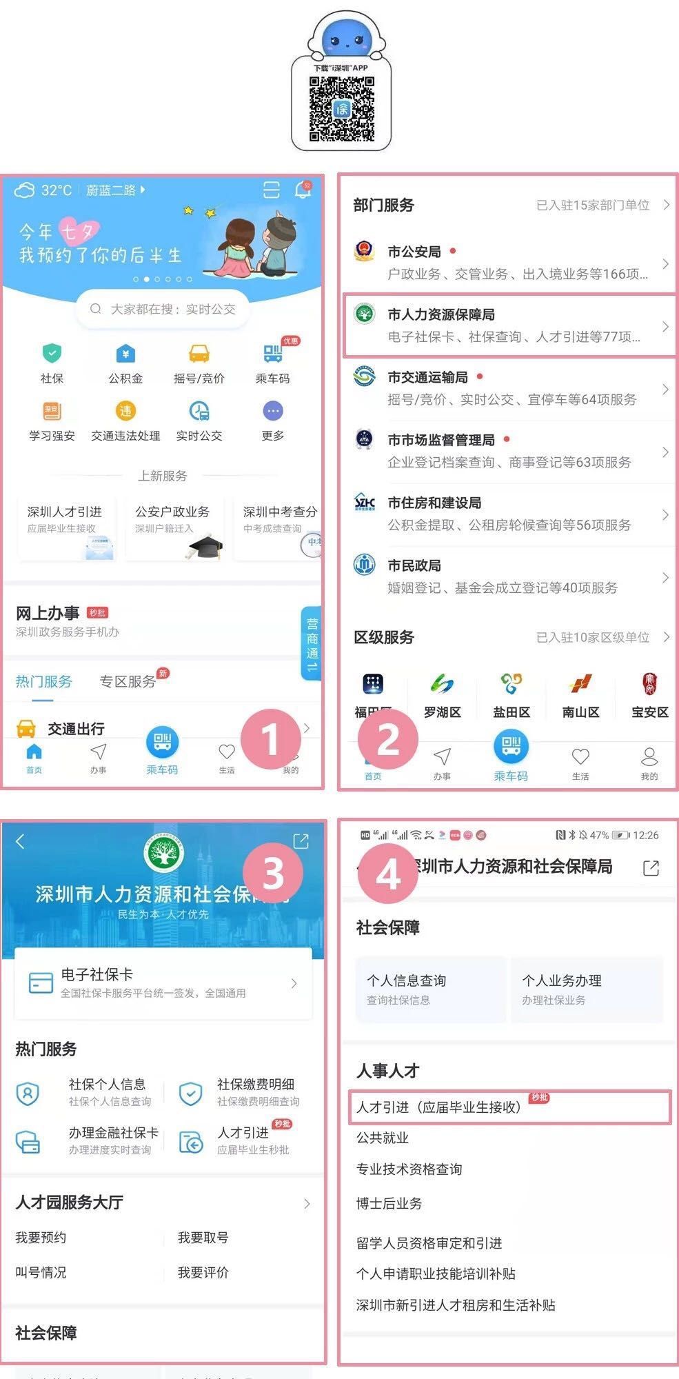 應(yīng)屆畢業(yè)生辦理人才引進(jìn)時(shí),可以選擇下載“i深圳”APP在手機(jī)上辦理,路徑為:“i深圳”首頁(yè)-市人力資源保障局-人事人才:人才引進(jìn)(應(yīng)屆畢業(yè)生接收)。