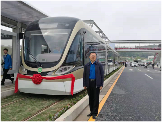 深圳龍華現(xiàn)代有軌電車開(kāi)通現(xiàn)場(chǎng),簡(jiǎn)煉與電容供電無(wú)接觸網(wǎng)的有軌電車合影。