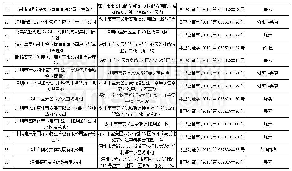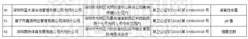 此次檢查結(jié)果顯示,深圳明門偉健體育服務有限公司(游泳池)、深圳市綠景物業(yè)管理有限公司城市立方花園管理處(游泳池)、深圳市盛世家物業(yè)管理有限公司花半里物業(yè)管理處(游泳池)尿素、游離性余氯兩項檢測指標不合格,深圳市力美健華聯(lián)健身有限公司(游泳池)pH值、尿素兩項檢測指標不合格,錦龍體育文化發(fā)展(深圳)有限公司(游泳池)、深圳市安居樂業(yè)物業(yè)管理有限公司(游泳池)、深圳市天健物業(yè)管理有限公司陽光天健城管理處(游泳池)pH值、游離性余氯兩項檢測指標不合格,此外,有45家游泳場所分別因pH值、尿素、游離性余氯、細菌總數(shù)以及大腸菌群等指標不合格被予以通告。衛(wèi)生監(jiān)督部門已責令抽檢結(jié)果不合格單位立即整改。