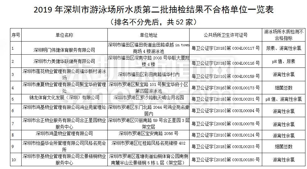 見圳客戶端·深圳新聞網(wǎng)2019年8月29日訊(見圳客戶端、深圳新聞網(wǎng)記者 劉夢婷 通訊員 深衛(wèi)監(jiān))深圳市衛(wèi)生健康委近期組織了各級衛(wèi)生監(jiān)督機構(gòu)對全市游泳場所水質(zhì)進行了分批專項抽樣檢驗,并在近日公布了2019年第二批游泳場所水質(zhì)抽檢結(jié)果。第二批共抽檢游泳場所451家,檢測指標為游離性余氯、渾濁度、尿素、pH值、細菌總數(shù)、大腸菌群等六項。抽檢的451家游泳場所中,合格399家,合格率為88.47%,不合格52家,不合格率為11.53%;不合格指標主要為游離性余氯、尿素、細菌總數(shù)、pH值和大腸菌群。
