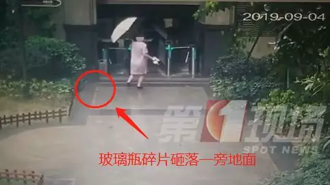 由于下雨天氣,所幸破裂的啤酒瓶砸在了雨傘上,最終從沈女士左側(cè)身旁滑落,沈女士也沒有受到傷害。